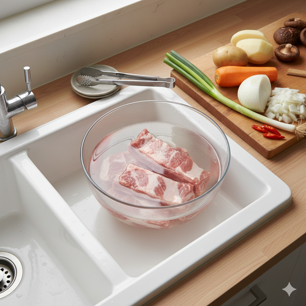 돼지갈비를 찬물에 1시간 정도 담가두세요.