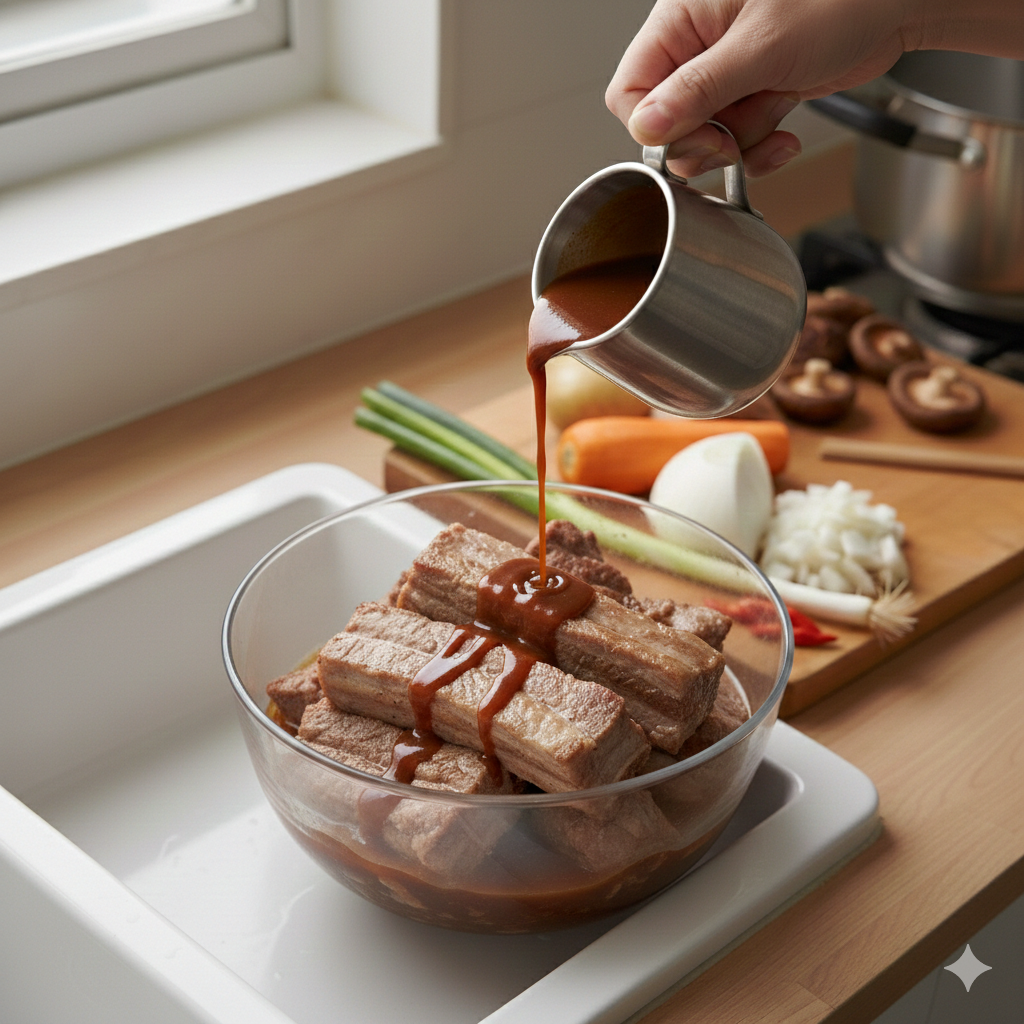 양념장을 잘 섞은 뒤, 갈비를 30분 이상 재워두세요.
