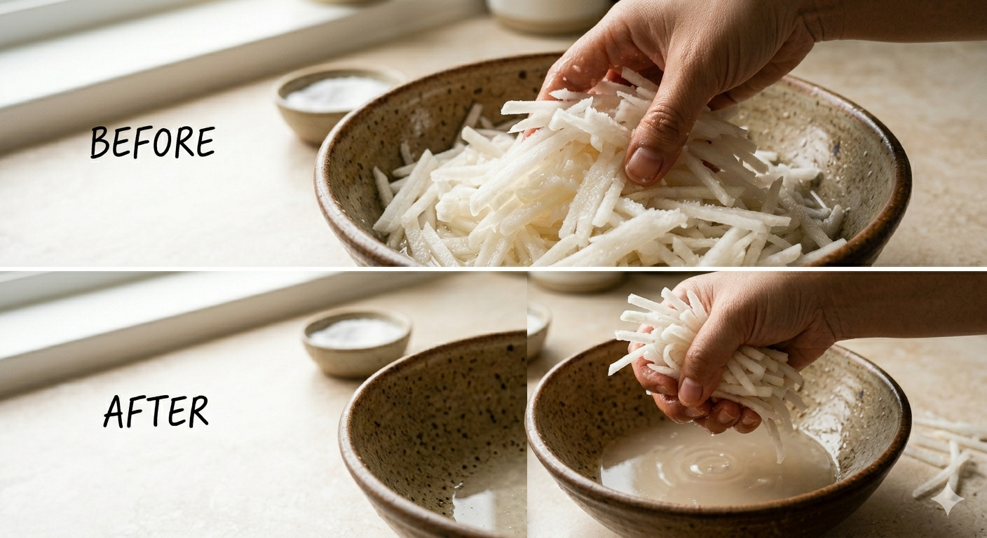 - 절인 무는 “꾹 짜지 말고” 가볍게만