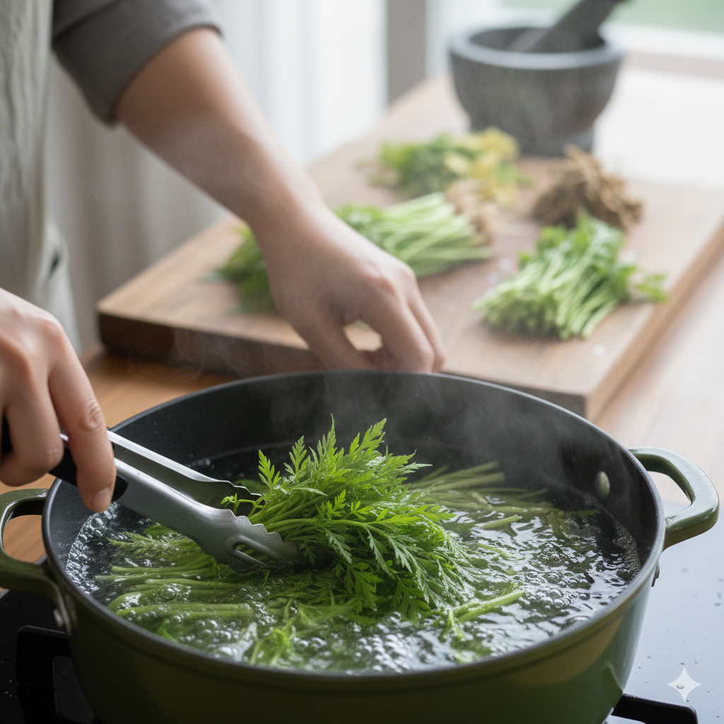 🌿 2. 미나리 손질과 데치기 (가장 중요!)